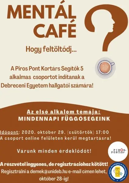 A DEMEK Piros Pont Kortárs Segítő csoportja elindítja az 5 alkalmas Online Mentál Café csoportját, ahol olyan témákat szeretnénk körbe járni, amely Téged is foglalkoztat.