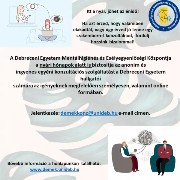 2021. 07. 28., sze – 10:15 A DEMEK a nyári hónapok alatt is biztosítja a hallgatók számára az ingyenes konzultációs szolgáltatást. Részletek az alábbi plakáton. Legutóbbi frissítés: 2023. 02. 24. 12:08