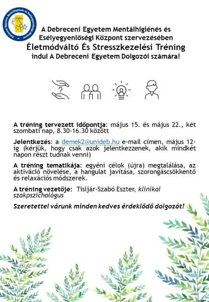 2021. 05. 03., h – 15:45 Életmódváltó és stresszkezelési tréning indul a Debreceni Egyetem dolgozói számára, a DEMEK szervezésében. A részletek ide kattintva olvashatók. Legutóbbi frissítés: 2023. 02. 24. 12:07